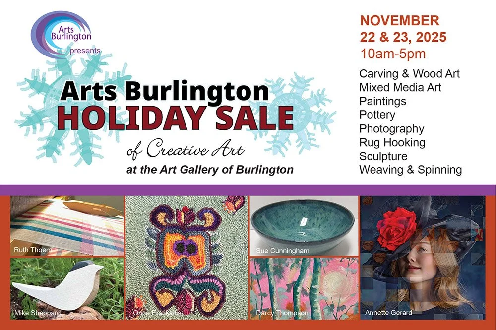 See and purchase the artworks of 100+ artists. Pottery, photography, fine art, mixed media, hooking craft, sculpture, wood craft, weaving & spinning. Something for everyone on your guest list! Location: throughout the Art Gallery of Burlington. Come and see us!